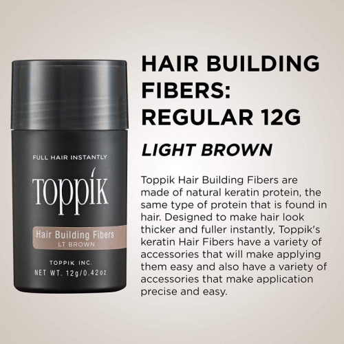Toppik gives the instant appearance of a thick, full head of hair. Toppik Hair Building Fibers are made from natural Keratin of the highest grade, the same type of protein found in real hair, which makes it look completely natural and undetectable. These natural Keratin fibers have an innate static charge that ensures they adhere to any type of hair—even the finest of hair—and resist wind, rain and perspiration.