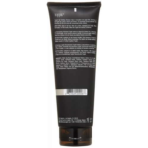 TOPPIK Hair Building Shampoo strengthens and repairs thin, thinning or damaged hair, giving it volume and fullness. The lightweight formula cleanses and nourishes the hair and scalp with concentrated Keratin proteins. Free of sulfates and parabens.