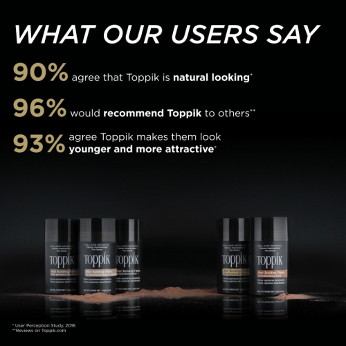 Toppik gives the instant appearance of a thick, full head of hair. Toppik Hair Building Fibers are made from natural Keratin of the highest grade, the same type of protein found in real hair, which makes it look completely natural and undetectable. These natural Keratin fibers have an innate static charge that ensures they adhere to any type of hair—even the finest of hair—and resist wind, rain and perspiration.