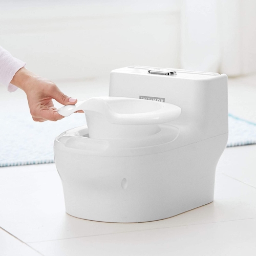 With the look and feel of a grown-up toilet, this sleek and modern potty helps little ones transition to the real thing with confidence! Pairing comfort and convenience, the seamless design features smooth, wipeable surfaces and a removable basin for easy clean-up. A back compartment holds a handy removable wipes case (included) or favorite books. Potty time over? Push the button at the top for a real flush sound to encourage and reward little ones for a job well done.