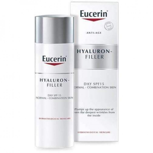 The Anti-Age Day Care by Eucerin with hyaluronic acid cushions even the deepest wrinkles from the inside out and makes the skin look noticeably smoother. A light fluid especially for combination skin or as a care in summer.An advanced non-comedogenic light day cream with SPF 15 and UVA protection to plump up even the deepest wrinkles from within. “* Refills even the deepest wrinkles from inside out* SPF15+ UVA Protection” “Eucerin Hyaluron-Filler Day Cream for normal to combination skin is an advanced anti-wrinkle formula for this specific skin type.The formula combines high and low molecular Hyaluronic acid to act at the origin of wrinkles, while bio-active Glycine-saponin supports skin’s own production of wrinkle-plumping Hyaluronic Acid. SPF 15 + UVA protection effectively prevent premature ageing and the deepening of existing wrinkles. The skin looks visibly smoother. Create an excellent make-up base. Non-comedogenic.How to use?Apply in the morning onto the face, neck and décolleté by gently massaging the cream into the skin, avoiding the delicate eye area.