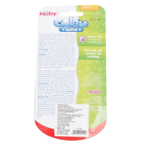 • Filled with sterilised water and can be placed in the refrigerator to provide a cool textured surface for teething pain